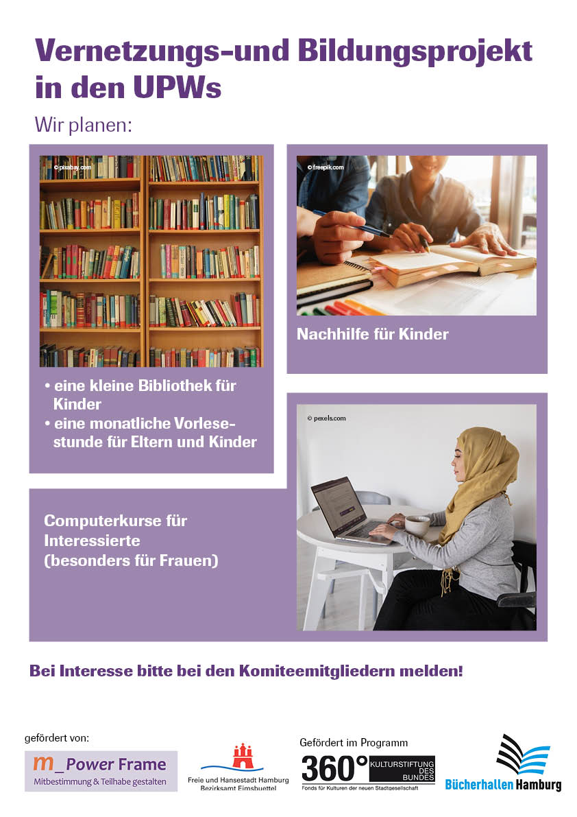 Es wird oft über Menschen in Flüchtlingsunterkünften geredet – selten mit ihnen. Oft wird über ihren Kopf hinweg entschieden – selten entscheiden sie selbst mit. Das will die Initiative „m_Power Frame“ ändern, in der sich Menschen mit eigenem Migrationshintergrund engagieren. Als ersten Schritt stellte m_Power Frame jeweils ein Komitee (Bewohner*innenrat) in den Unterkünften in der Oliver Lißy Straße und im Duvenacker auf die Beine, das die Bewohner*innen stärkt und dafür sorgt, dass sie ihre Belange demokratisch legitimiert formulieren.Hinter m_Power Frame stehen Homayoon Pardis als Projektmanager am Eidelstedter Bürgerhaus und Community Organizerin Anne Busch. Homayoon Pardis stammt aus Afghanistan und lebt seit Anfang 2016 in Hamburg. Bis September 2020 arbeitete Asmara Habtezion als Community Organizerin des Projektes. Unterstützt wird das Team von zwei Kulturmittler*innen, damit es keine sprachlichen Verständigungsschwierigkeiten gibt.